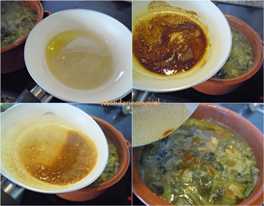 En una sartén pequeña pon un chorrito de aceite a calentar, cuando esté caliente apaga el fuego y echa el pimentón, mueve la sartén para que se mezcle bien y añade un cacito del caldo de la olla, remueve otra vez y echa todo en la olla.