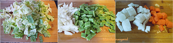 Pela y corta en trocitos la zanahoria, las patatas, el nabo y la cebolla.