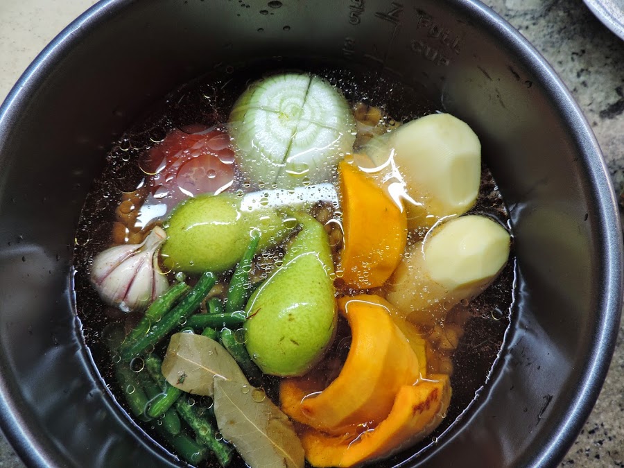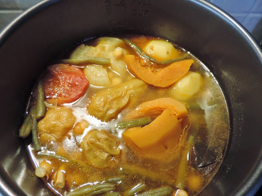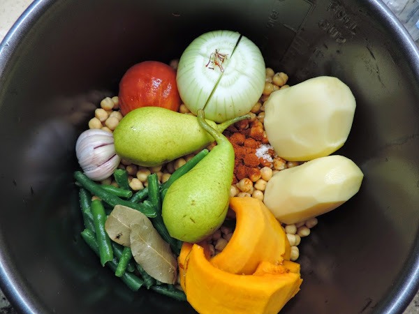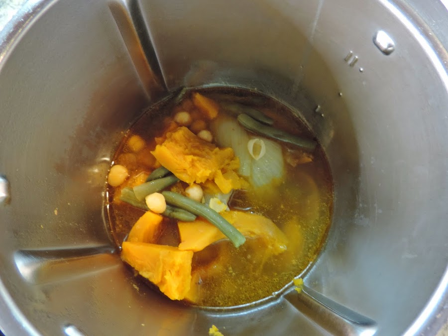 Ahora sacamos la calabaza, algunas judías verdes, cebolla, tomate, unos garbanzos y un poco de caldo, y lo ponemos en el vaso de la thermomix.