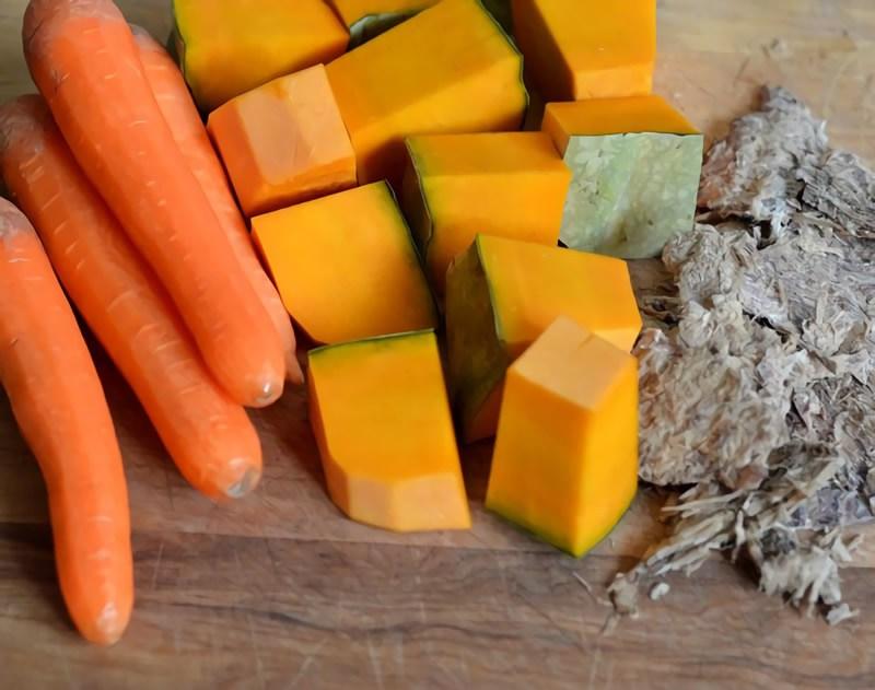 Las zanahorias pueden ser en rodajas y el zapallo en cubos no muy grandes tampoco muy chico por que se rompe mucho cuando revolvemos la olla.