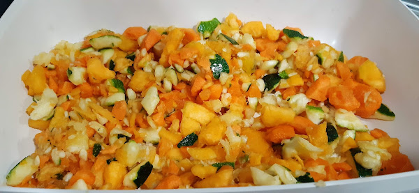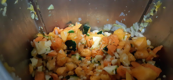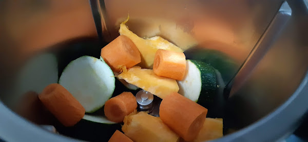 1.- Lavamos y pelamos la verdura. Cortamos el calabacín, la calabaza, el boniato, la zanahoria en trozos y la ponemos en el vaso de la thermomix. Programamos 10 segundos, velocidad 4. El punto del troceado, depende de cómo os guste a cada uno. A mí no me gustan los trozos muy grandes y por eso he puesto 10 segundos, si no con 5 ó 6 tenéis bastante. Reservamos en un bol.