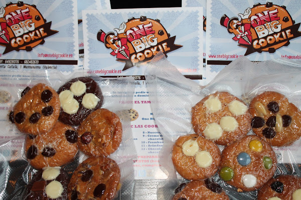 Me picó la curiosidad y me puse a investigar sobre esta empresa de reciente creación. Raquel y Daniel son una pareja que para hacer frente a estos tiempos de crisis que corren, se lanzó a la piscina para hacer lo que más les gustaba y acercar al público un producto artesanal de calidad. Así surgió ONE BIG COOKIE, una empresa que permite al cliente escoger entre una gran variedad de cookies desde su propia casa y recibirlas cómodamente y en perfecto estado. Podéis elegir entre cookies de distintos tamaños, hasta la "one big cookie" (150 gramos de galleta para los más golosos) y de multitud de sabores: chocolate, lacasitos, chocolate blanco, arándanos, limón, etc... Si sois como yo, incapaces de decantaros por un sabor concreto, tienen a vuestra disposición cajas degustación para que catéis estas delicias.