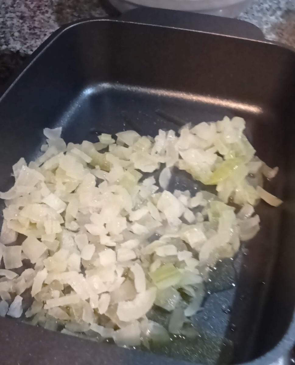 1.Preparar todos los ingredientes sobre la mesada ( Mise en place)2.Rehogar la cebolla picada con un poco de aceite en la olla que vas a hacer todo, esta vez use la Essen rectangular .