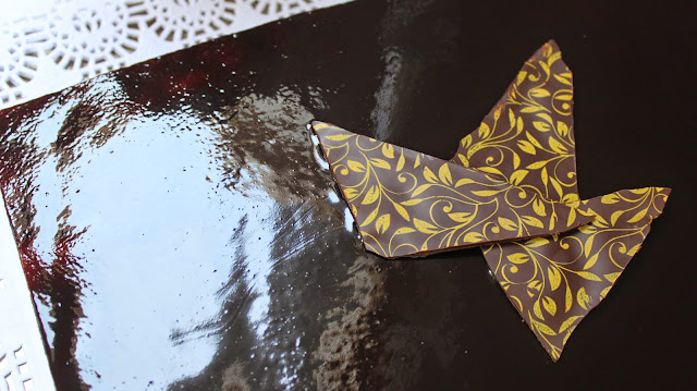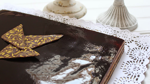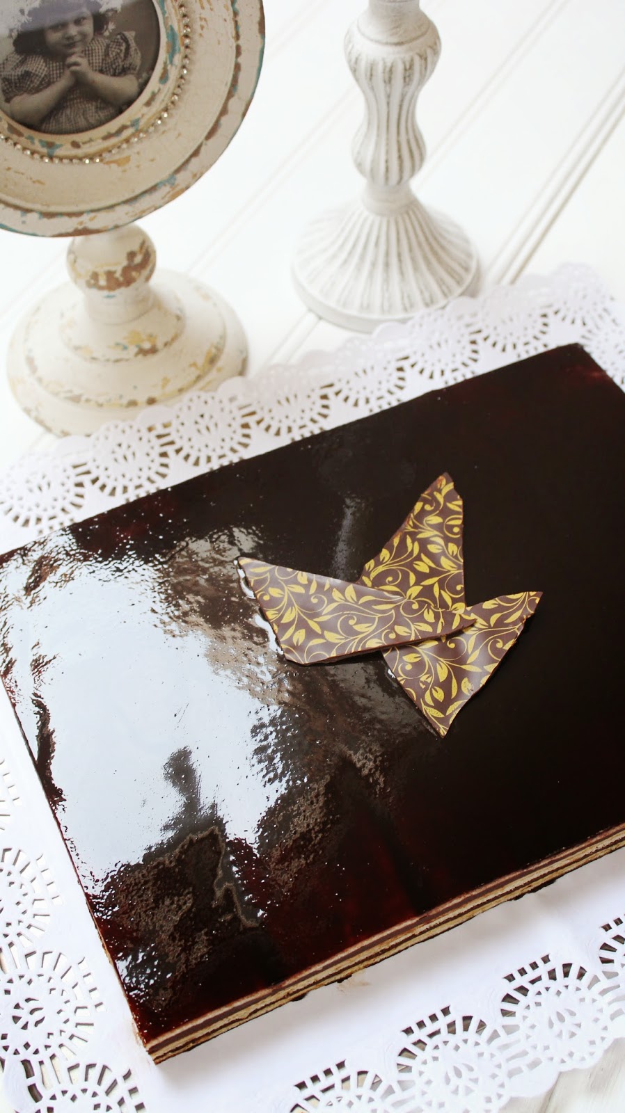 Tradicionalmente, se decora con papel de oro pero yo no tenía y he utilizado chocolate con hojas de transfert.