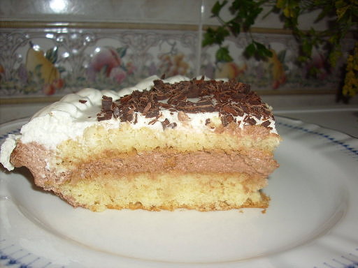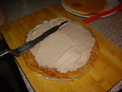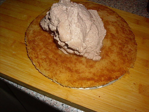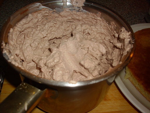 se monta la nata (crema de leche) y a la mitad del batido añadimos el cacao y el azucar
