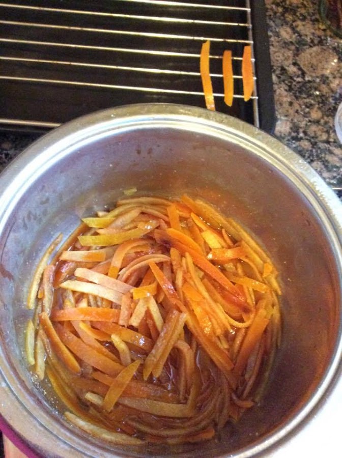 Añadimos las naranjas y ponemos a fuego fuerte. Cuando rompa a hervir, lo dejamos cinco minutos y apagamos el fuego. Sin moverlo del fogón, tapamos y dejamos reposar hasta que enfríe. Este paso debemos repetirlo varias veces. Yo suelo darle el primer calentón por la mañana, otro por la noche y otro a la mañana siguiente. Dependiendo de cómo esté el almíbar puede darse otro golpe más (tiene que ser un sirope).