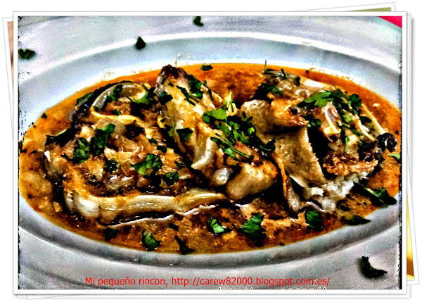 Ahora emplatamos, yo utilizo un plato hondo de porcelana de la fábrica Porvasal en Chiva (Valencia), en el fondo echamos un par de cucharadas de la salsa y encima 3 trozos de la oreja a la plancha, volvemos a poner salsa y perejil picado.