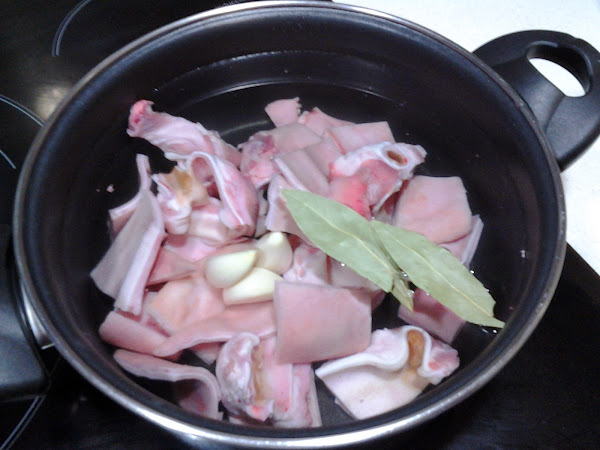 Llenamos una olla con abundante agua y ponemos la oreja, el laurel, los dientes de ajo y sal. Encendemos el fuego y cuando rompa a hervir lo dejamos a fuego medio-bajo de 1 hora y media a 2 horas.
