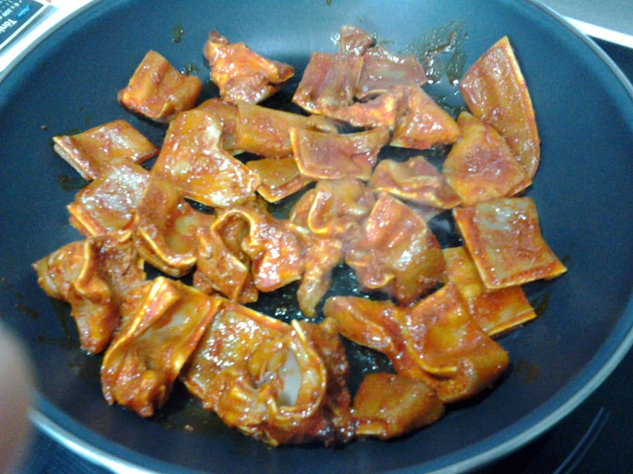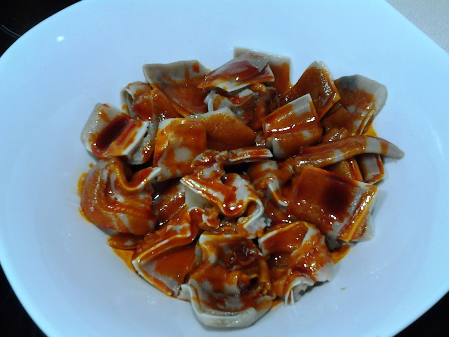 Cuando la oreja esté bien cocida, la ponemos escurrida en un bol y agregamos el aceite de pimentón. Lo mezclamos bien y lo metemos en la nevera mínimo 4-5 horas. Con el agua de cocción podéis preparar un arroz como ESTE, está buenísimo!!!