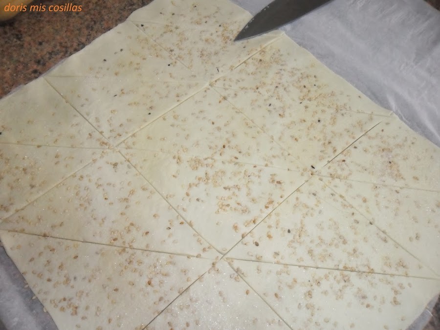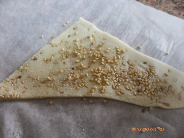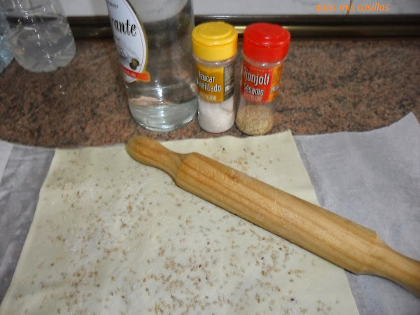 2º> Espolvoreamos abundantemente la masa de hojaldre con sésamo y azúcar avainillada y pasar el rodillo.