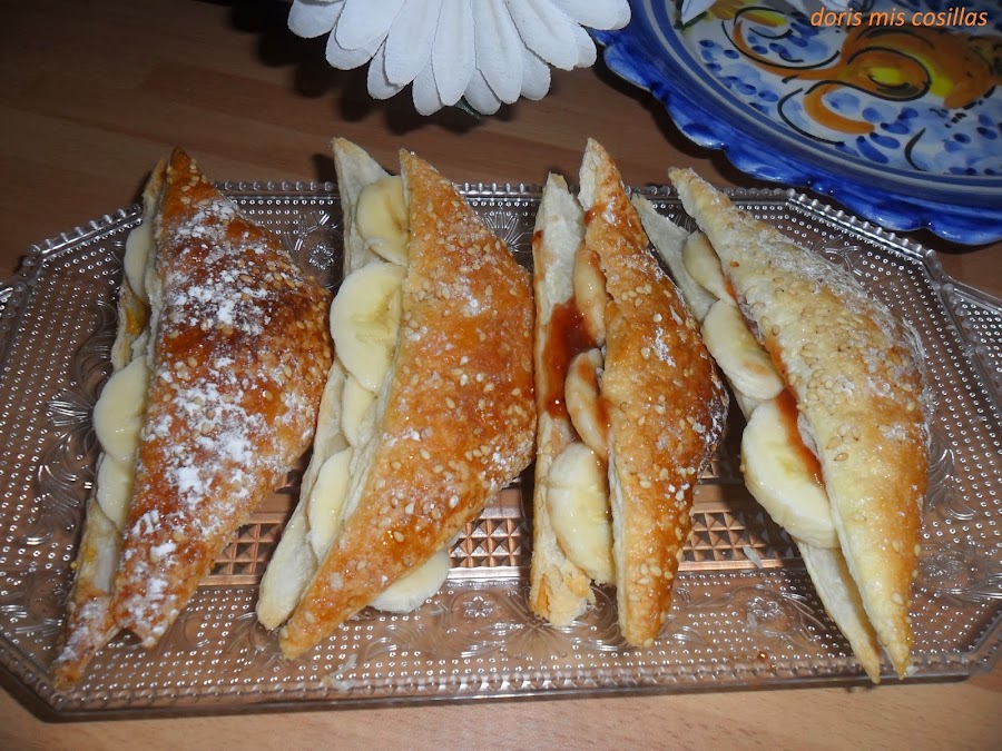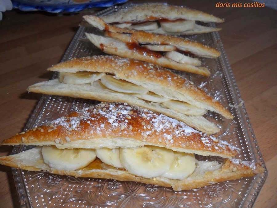 Cortamos por el centro, poner dos cucharitas de mermelada de fresa, cortamos rodajas de banana o platano cerramos y espolvoreamos con azúcar glass.