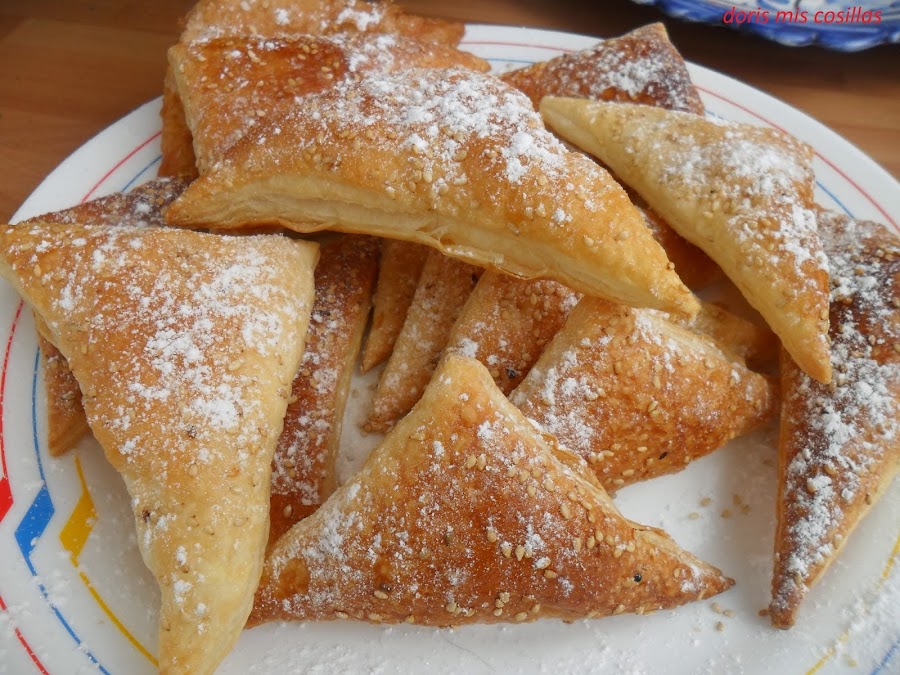 3º> Cortamos triángulos con un cuchillo bien afilado como se aprecia en la foto y pincharlas con un tenedor cada oreja.