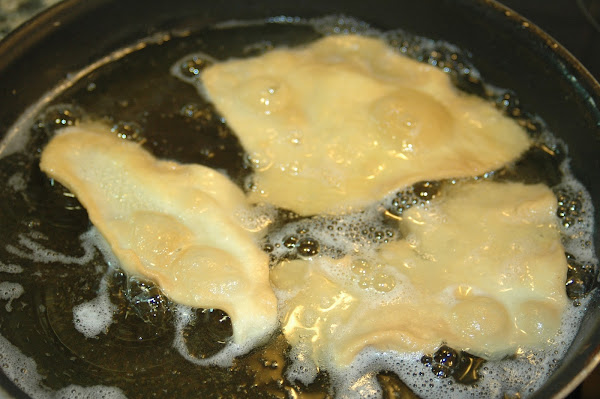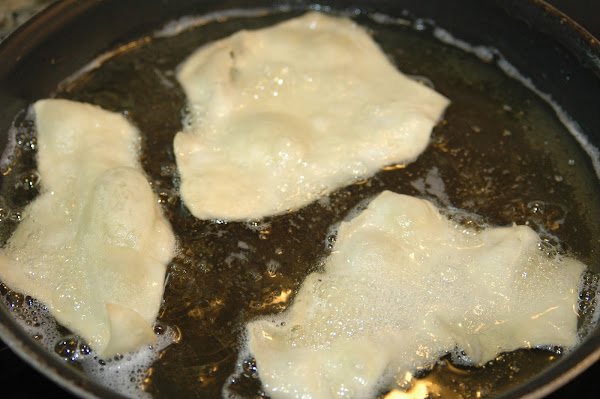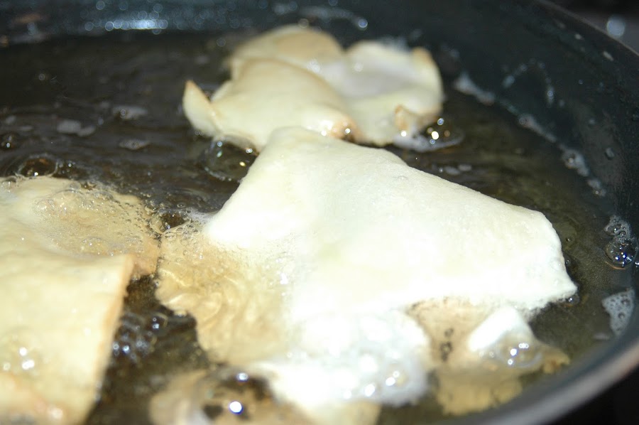 Le saldrán globitos, es decir, se inflan al contacto con el aceite caliente, (observar la imagen); la masa se separa como si fuera una empanadilla pero de forma irregular.