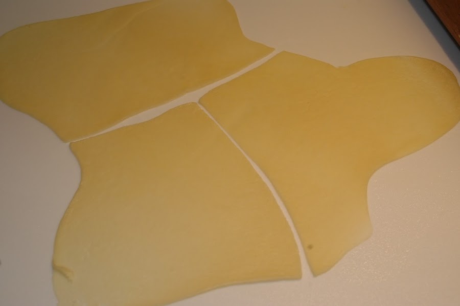 Se cortan al tamaño de la palma de la mano y con se le da forma de oreja de cerdo, si queréis ser unos artistas (de ahí su nombre). Y sino, simplemente hacerle uno o dos cortes según vuestro criterio y medida de sartén (la mía es de 26 ctm). Según vais echándolas en la sartén podéis vigilarlas mientras estiráis la siguiente.