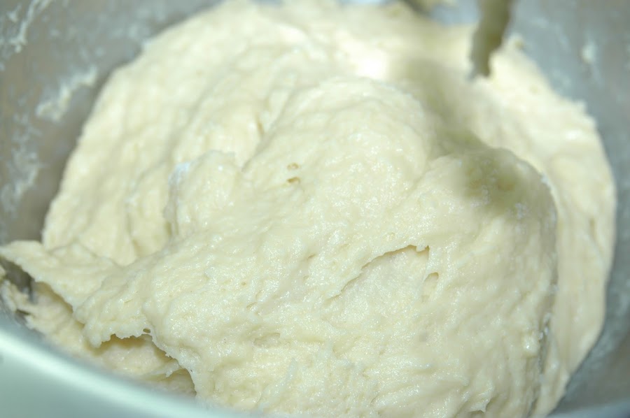 Yo utilizo una batidora automática que tiene distintas varillas según el grosor de la masa y que en ese momento cambié a la de amasado. Si lo hacéis a mano irle echando la harina y mezclarlo con la cuchara de madera hasta que veáis que tiene consistencia para meterle las manos y amasarla.