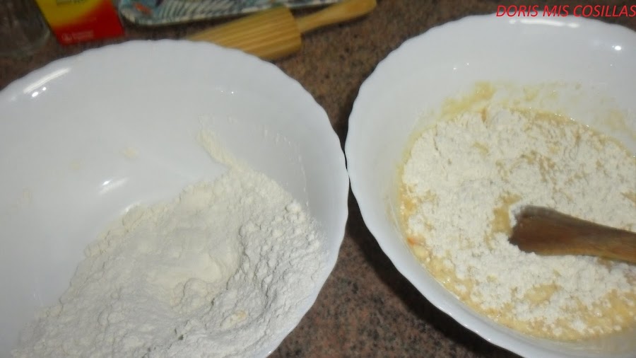 Mezclamos muy bien todos los ingredientes líquidos y vamos agregando la harina con la levadura química por cucharadas a la mezcla líquida y con una espátula compactamos bien.