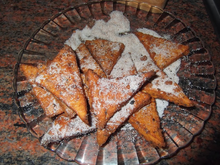 El último paso es rebozarlas en azúcar y canela. Un dulce muy rico y típico de estos días. Yo he utilizado anís en grano, aunque en las recetas clásicas se utiliza anís seco.
