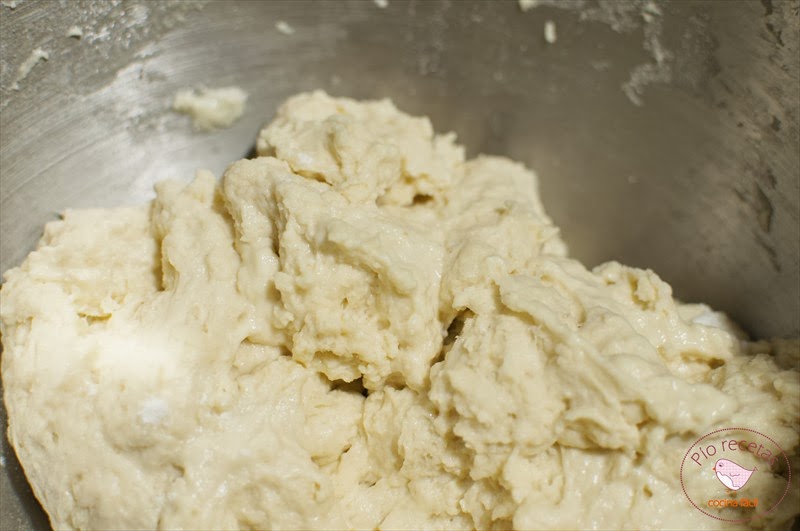 Añadimos la harina mezclada con la levadura y amasamos hasta obtener una masa uniforme.Añadimos la manteca y seguimos amasando hasta que se integre.Yo use una batidora eléctrica con la pala pero podéis hacerlo a mano sin problemas.