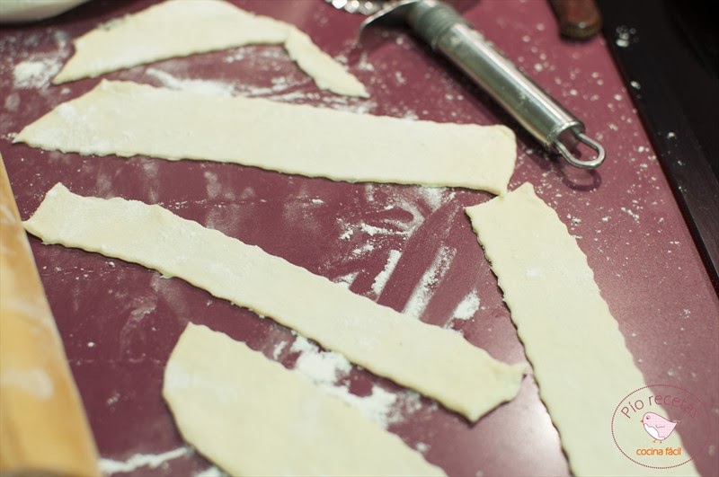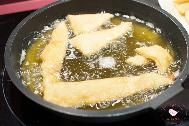 Una vez reposada vamos cogiendo porciones de masa y la extendemos bien fina con un rodillo.Poned harina para que no se pegue la masa a la mesa al estirarla.Cortamos trozos irregulares con un cortapastas o un cuchillo y freímos en aceite caliente.