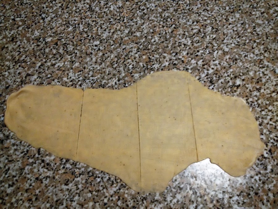 Una vez la masa haya reposado toca hacer las formas de las orejas. Os recomiendo que trabajéis la masa con el rodillo por porciones pequeñas y no toda de una vez puesto que de esta manera será más fácil que quede fina. Una vez tenemos la masa estirada cortamos los trozos como más nos guste (no os podría decir una forma determinada porque yo lo hago como sale y estoy segura de que esto es así en todas las casas en las que se hacen orejas jaja).