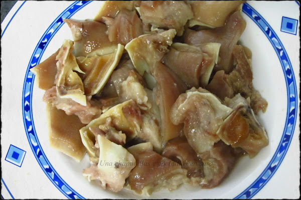 A poder ser, comprar las orejas ya limpias sino, limpiarlas muy bien y quemar los pelos con soplete de cocina.