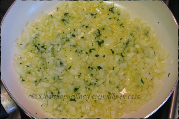 Picar la otra media cebolla en brunoise, el diente de ajo y poner a pochar en una sartén con un chorrito de aceite de oliva. Echar un poco de sal y el perejil.