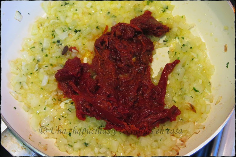 Una vez pochada, se añade la pulpa de los pimientos y la guindilla de cayena. Remover el conjunto.
