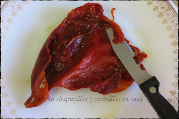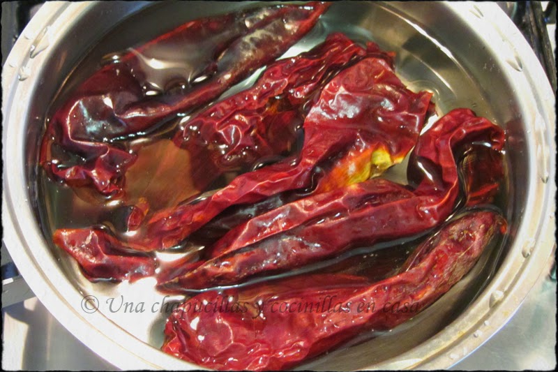 Poner los pimientos choriceros en agua a hervir durante 10-15 minutos para poder sacarles la pulpa.