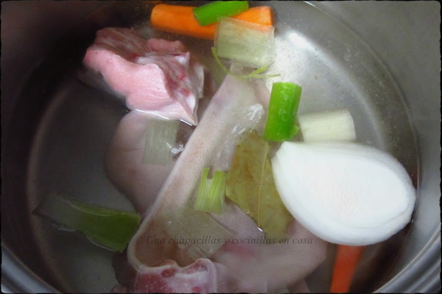 Cocer en una olla a presión con media cebolla, laurel, pimienta, zanahoria y un puerro. El tiempo; unos 25-30 minutos.