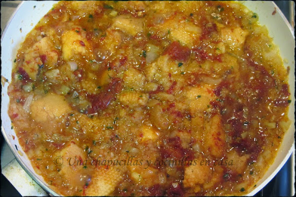Agregarle el jugo de los pimientos choriceros y caldo de la cocción a vuestro gusto dependiendo de si la quereis mas espesa o mas ligera. Dejar borbotear a fuego lento unos 10 minutos.