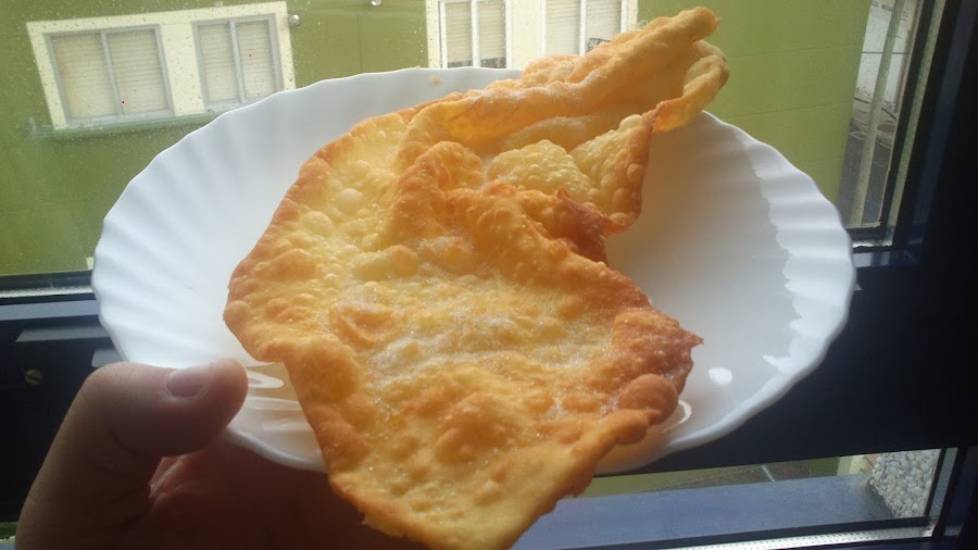 Al pasar el tiempo de reposo espolvoreamos harina sobre la encimera y estiramos pedacitos de masa con un rodillo de cocina. Las freímos en abundante aceite. Cuando estén doradas las ponemos en papel absorbente y les echamos azúcar por encima.