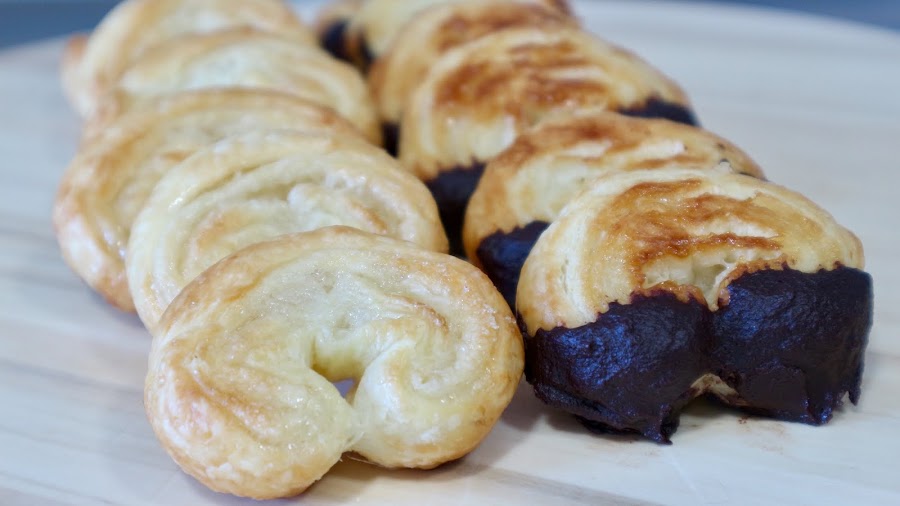 - 320 grs de hojaldre (2 placas) - azúcar - azúcar vainillado - 50 ml de leche - 150 grs de chocolate - 25 grs de mantequilla