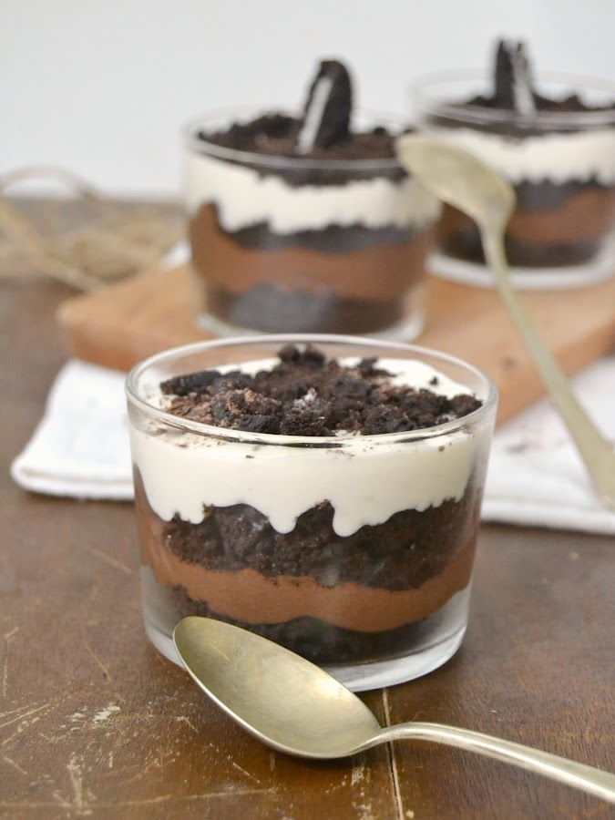6.- Para decorar los vasitos nada más sencillo que colocar media galletita Oreo ¡Y listos! Solo queda, si puedes aguantar la gula, dejarlo reposar en la nevera una hora para que las cremas asienten.