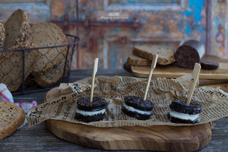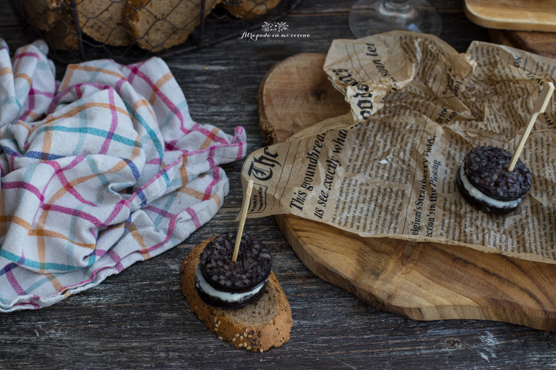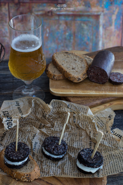 Con estas falsas ´"Oreo" os aseguro que vais a triunfar en la mesa. Hace unos meses las probé de tapa en un restaurante y tenía ganas de prepararlas en casa, y en cuento he podido las he hecho en casa. Son muy fáciles de elaborar, lo único que tenemos que hacer es preparar un ratito antes la crema de queso de cabra, y evitar montar la falsa galleta cuando esté la morcilla muy caliente para evitar que se derrita la crema de queso.