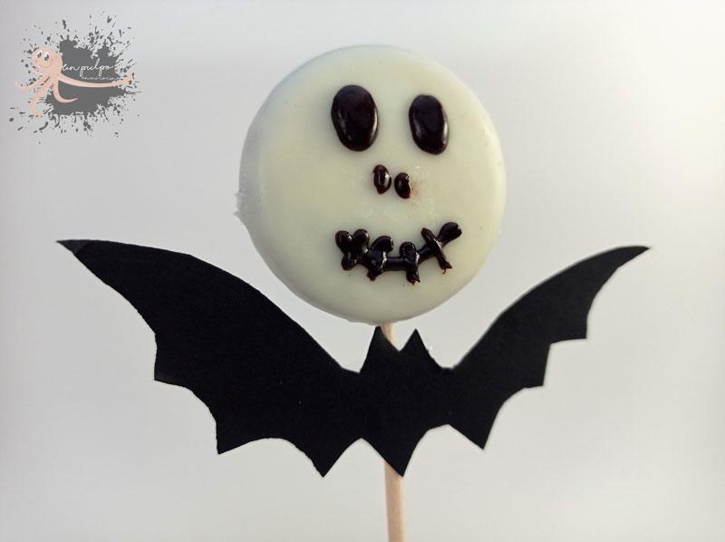 Pegamos el murciélago a la brocheta y servimos nuestras oreos decoradas para este Halloween.