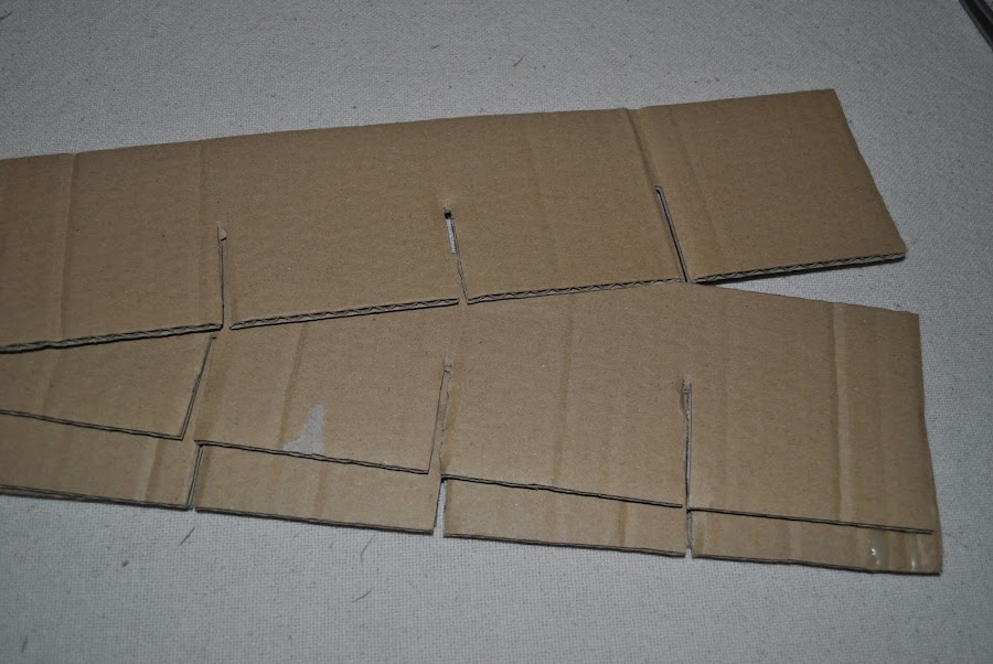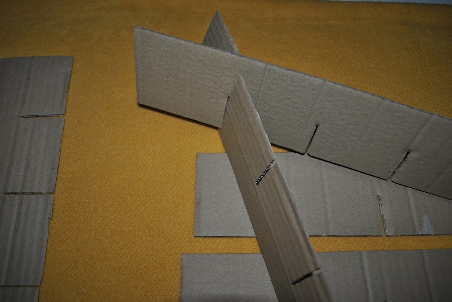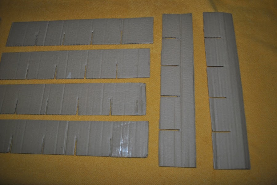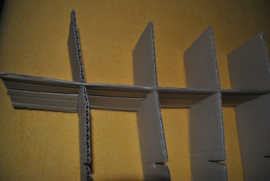 Estas tiras, posteriormente, deberán ser marcadas para hacer los cortes de encaje (cortas hendiduras hasta la mitad de la pieza y de un ancho del grosor del cartón.)