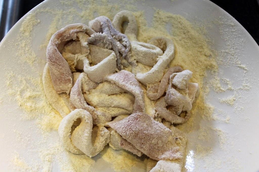 Salpimentamos bien y pasamos por la harina de freiduría de manera que queden bien rebozados por todo.