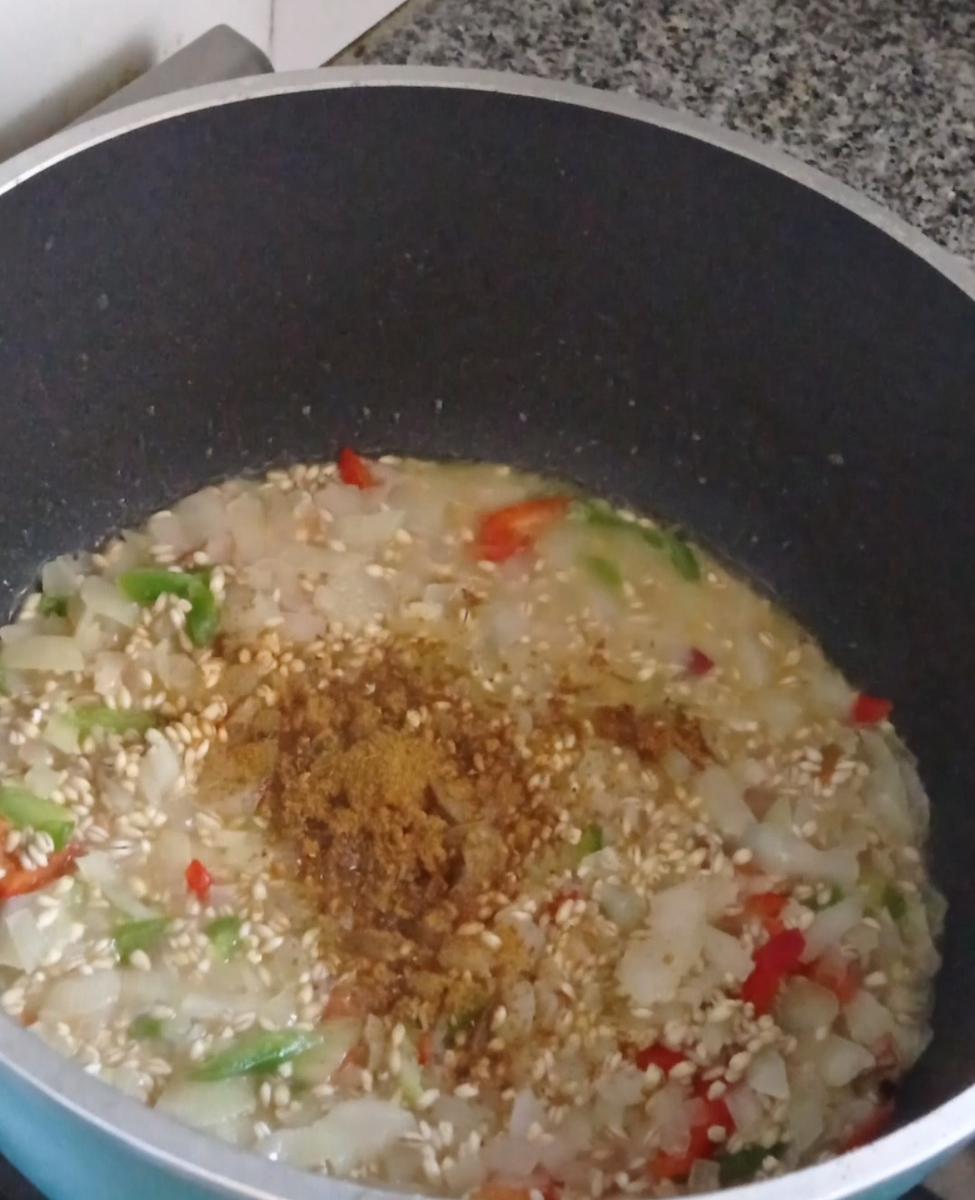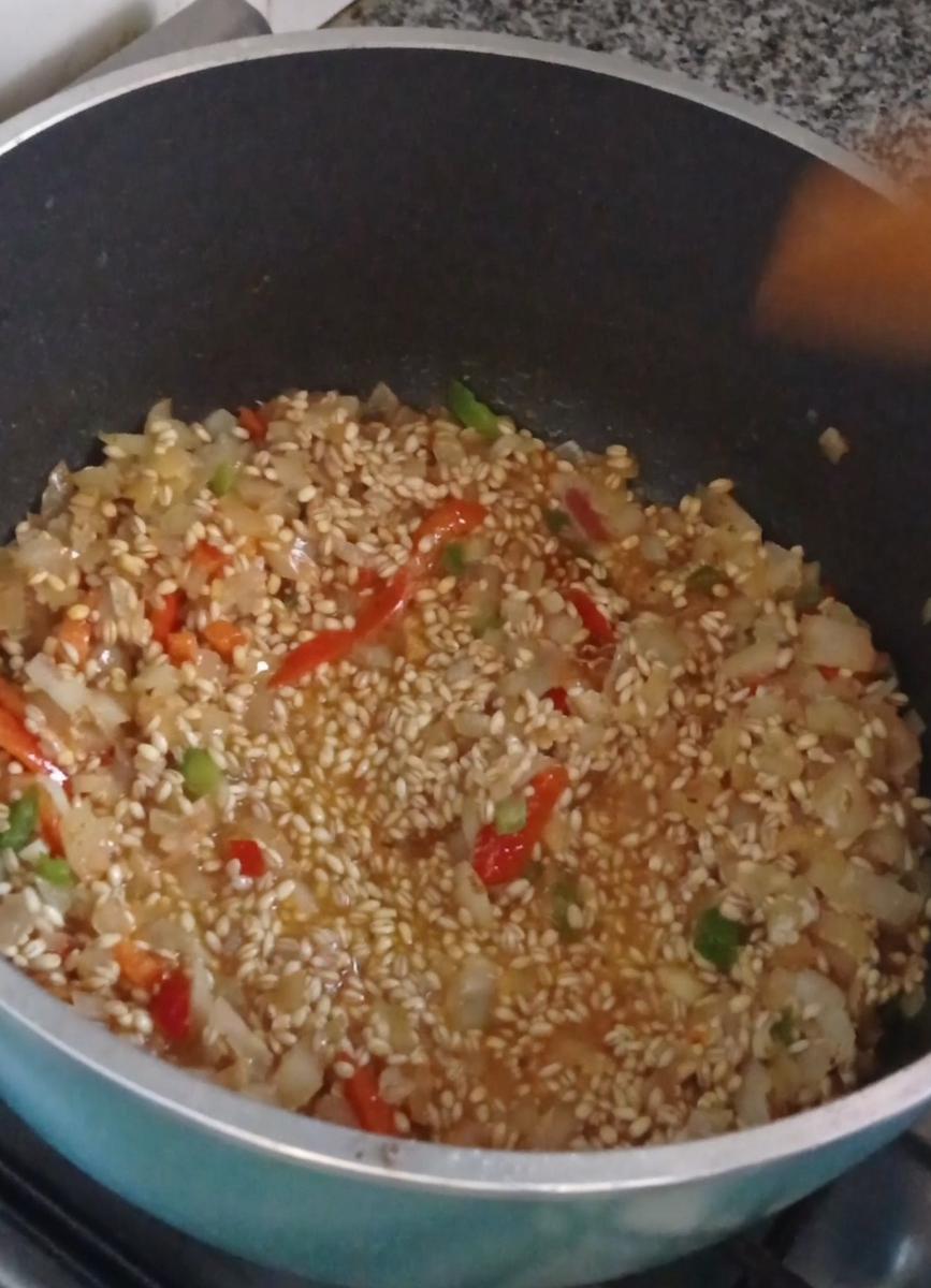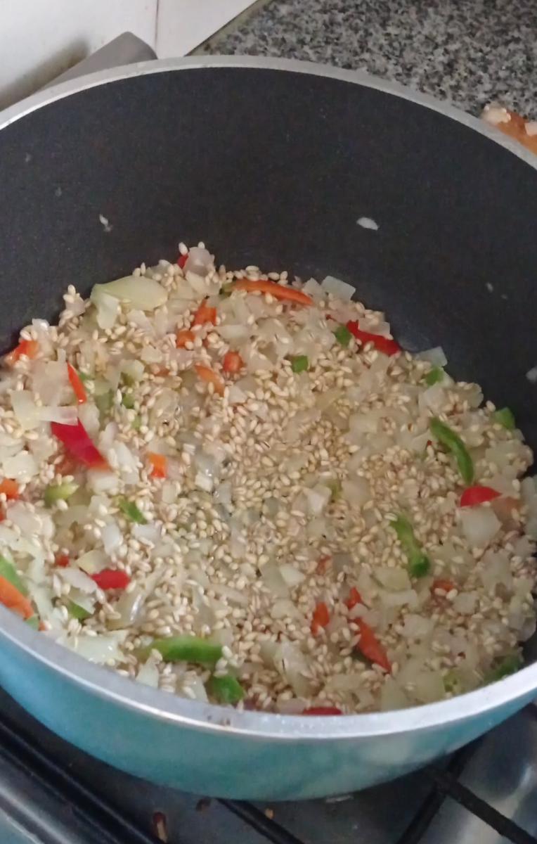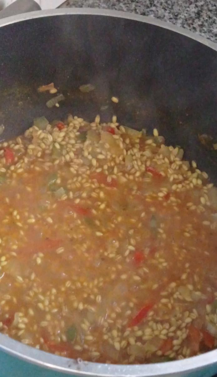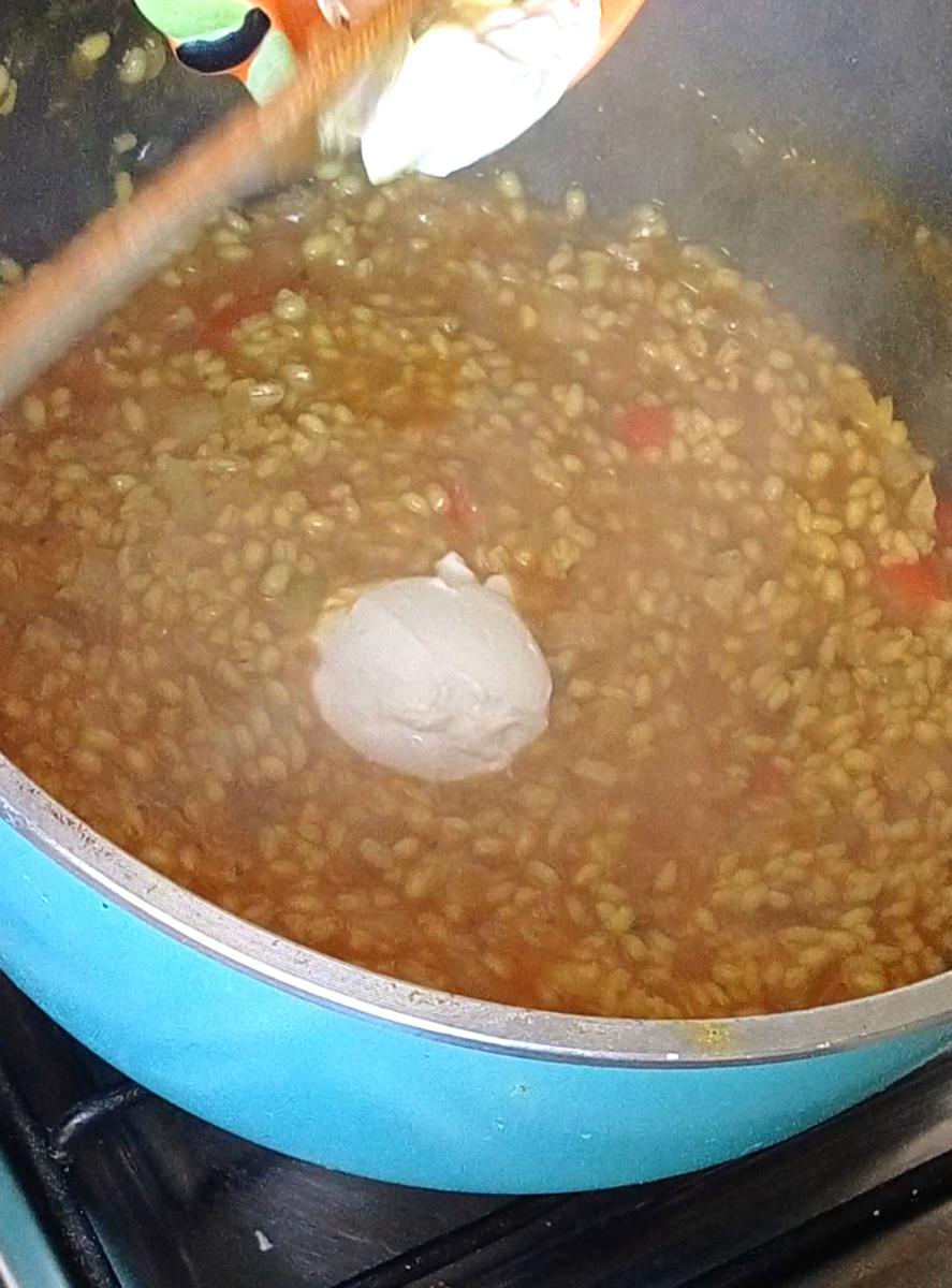Agregar el caldo hasta cubrir el arroz, siempre a fuego bajo y revolviendo y cuando se vaya consumiendo el caldo ir agregando y revolviendo para ayudar a que la cebada suelte el almidón