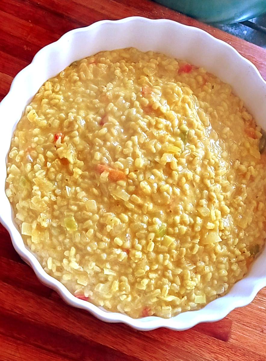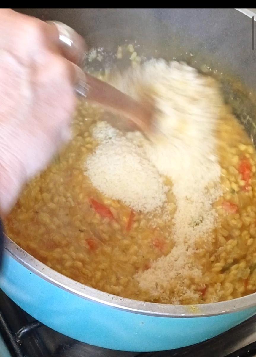 Cuando la cebada esté blanda y la preparación cremosa agregar el queso crema, luego el queso rallado y por último la manteca.
