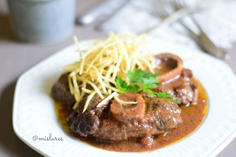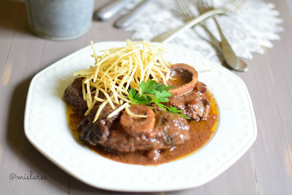 Os recuerdo que este tipo de guisos están mejor cocinados de un día para otro pues ganan en sabor. Si los acompañamos de patatas fritas paja, como yo, las hacemos momentos antes de comer y se lo añadimos al plato a la hora de servirlo.