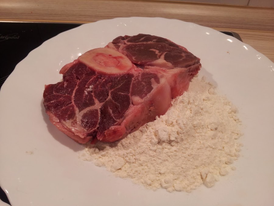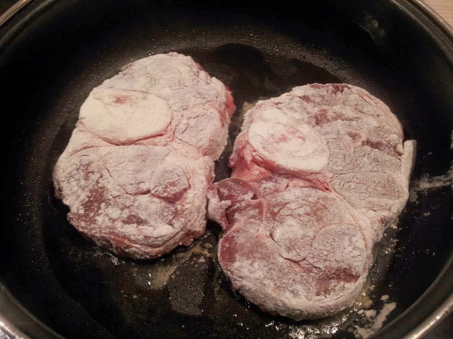 Cogemos las piezas de ossobuco (pieza de morcillo) y les practicamos un corte en los lados. Con esto se evita que la carne se encoja a la hora de cocinarla. Los enharinamos y los freímos unos minutos en una cazuela baja con aceite de oliva o mantequilla. Cuando estén doradas ambas caras, sacamos y reservamos.