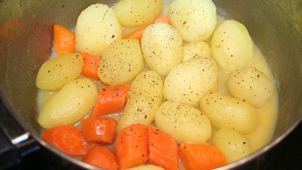 La guarnición de patatas y zanahorias ya están cocidas. Les he añadido un poco de mantequilla y un poco de pimienta molida.