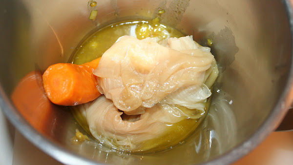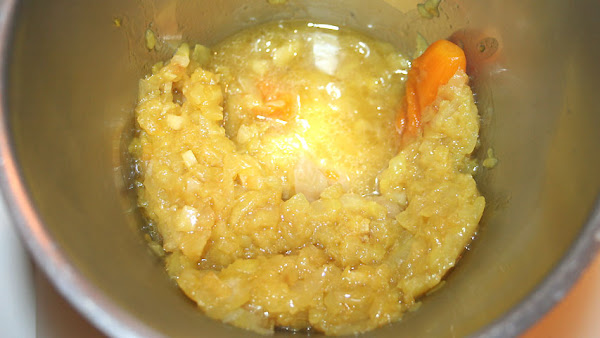 Aquí ya he añadido el refrito de cebolla y ajo junto a las verduras para triturarlas. Podría haber puesto también tomate en el refrito pero en esta ocasión no lo he hecho.
