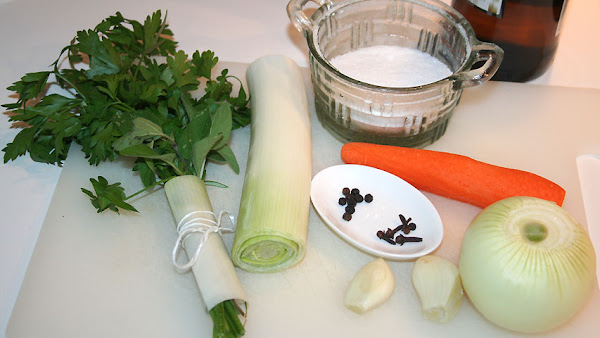 El ramillete aromático, el puerro, la zanahoria, la cebolla, los ajos, los clavos y los granos de pimienta con los que coceré la carne.