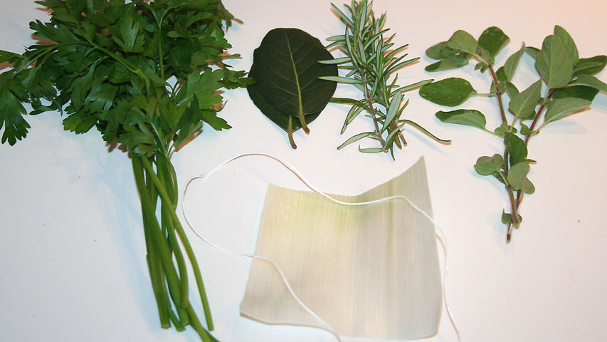 Con la hoja externa del puerro, perejil fresco, laurel, romero y orégano fresco hago un atadillo para aromatizar la preparación.
