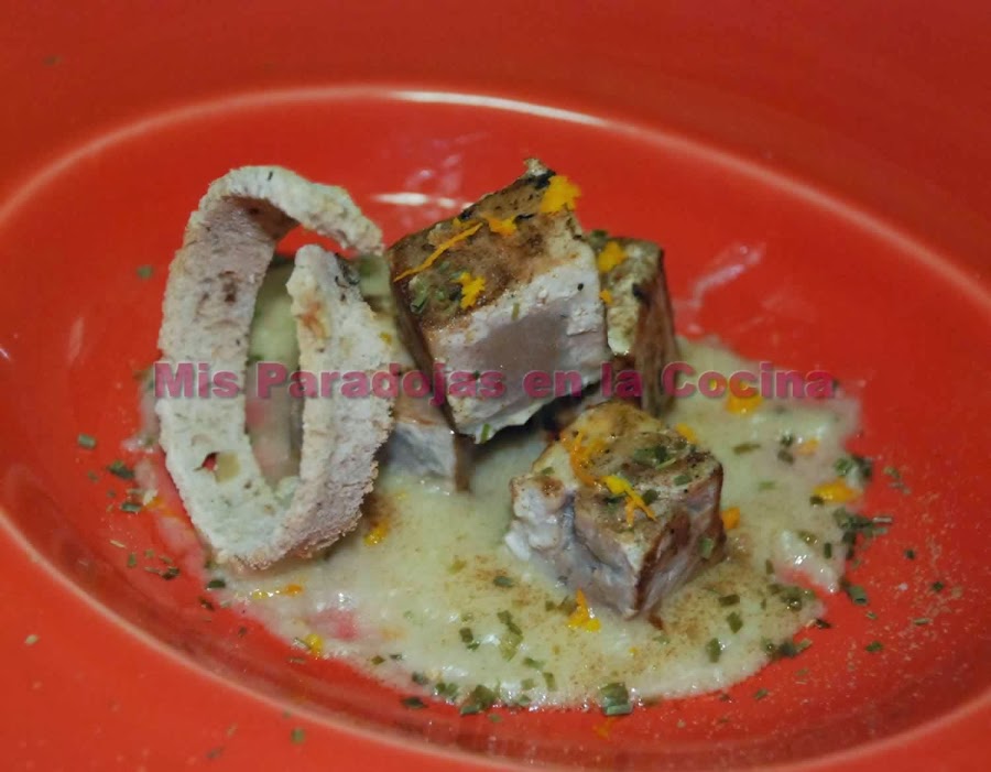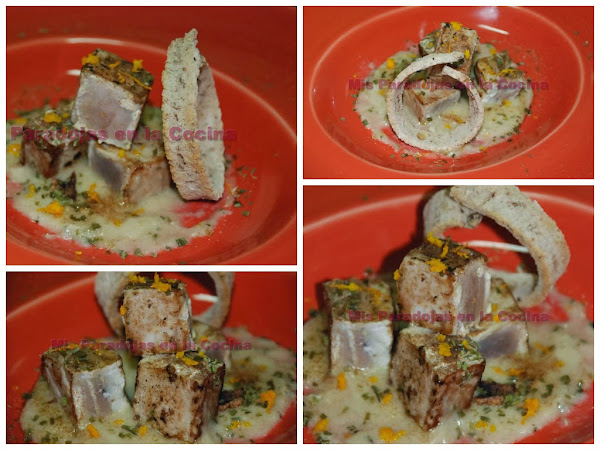 CUARTO: Marcamos los dados de atún. Servimos inmediatamente con un fondo de salsa de sobreuso, ponemos encima los dados, sazonamos con sal ahumada, decoramos con cebollino picado, cáscara de naranja recién rallada y el pan. Y estos son dos resultados de presentación.