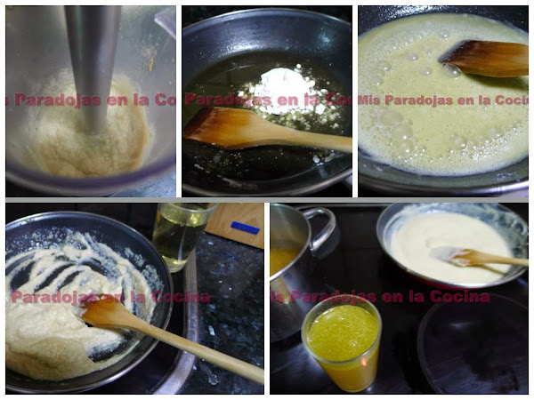 SEGUNDO: Trituramos la cebolla y los ajos. En la sartén reservada previamente, freímos una cucharada de harina para quitarle el sabor a crudo. Añadimos un vaso de fino DO Jerez y dejamos que evapore unos 10 minutos removiendo con frecuencia. A continuación agregamos 1-2 vasos del caldo de pescado colado y seguimos removiendo hasta que la salsa nape.