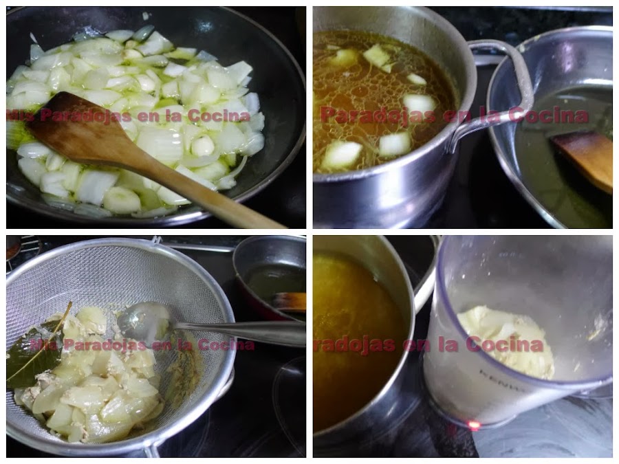Pochamos la cebolla y el ajo en mirepoix. Añadimos el pochado al caldo con una hoja de laurel y dejamos cocer unos 15 minutos. Colamos el caldo. Obtenemos caldo limpio y ponemos los ajos y cebolla sin la hoja de laurel en un vaso para turbinar.