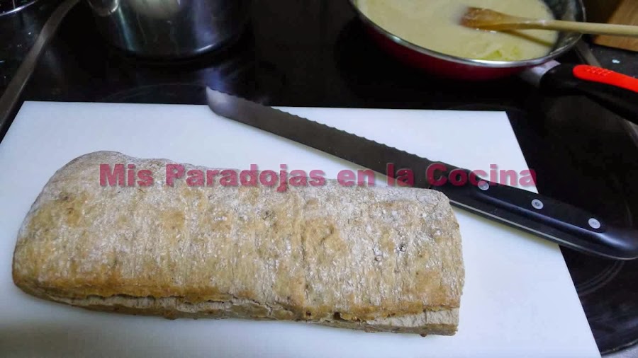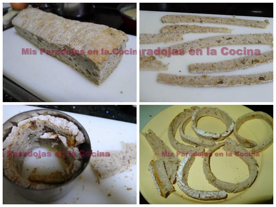 TERCERO: Tomamos una pieza de pan, en mi caso una barra de chapata integral con nueces, y quitamos la corteza de los lados dejando la superior e inferior. Os recomiendo que semicongeléis la pieza antes de esta operación. Evidentemente vale cualquier tipo de pan a vuestro gusto. Cortamos lo más fino que podamos los laterales para sacar tiras largas que cortaremos del ancho deseado. Las ponemos al horno dentro en un cortapastas para que tomen forma hasta que se soasen (si lo preferís podéis llegar a tostar). Reservamos.