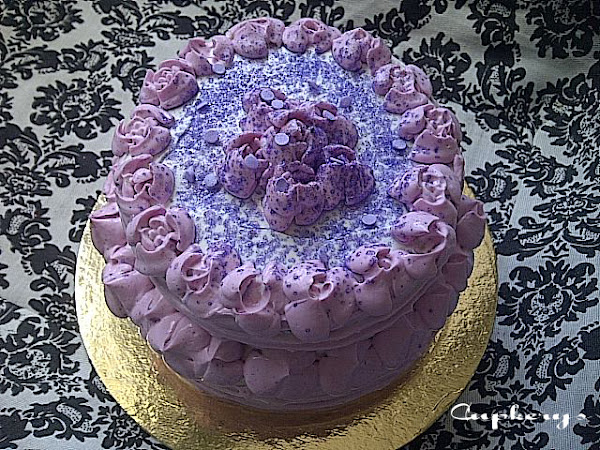 El colorido y la presentación, es porque es para el cumple de una peque que adora el Morado en todas sus variaciones, así que la crema de queso está coloreada para que la chica la disfrute un poco más.
